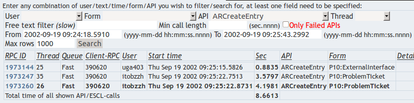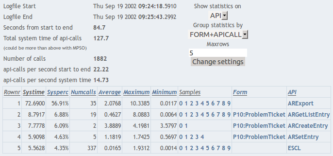 The starting page show API-statistics, where the calls using the most system resources is placed at the top. By clicking on the sample links 0 through 9, you can view all the details of specific call of this type, shown in the second image. The slowest call will have index 0.